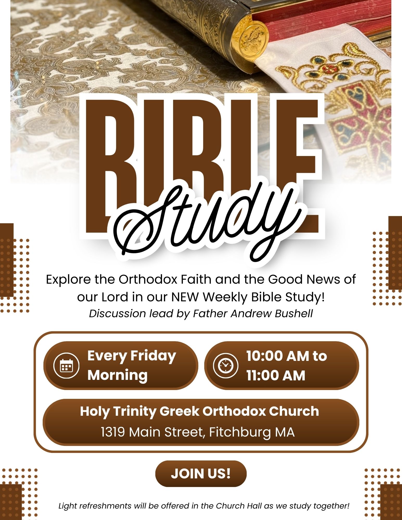 Join us every Friday morning in our Holy Trinity Church Hall, 10:00 AM - 11:00 AM, as we discuss the message of the Gospel, the Good News of our Lord and Savior Jesus Christ, and the importance of Holy Scripture in our everyday lives. Discover how we, as human beings living in the 21st century, can not only understand the message of Holy Scripture, but also begin to experience the joy and love of the Gospel in new and inspirational ways. Engage in thoughtful discussions, both with Father Andrew and with peers, that seek to answer the difficult questions that we may have about the Scriptures, and its relevance to the context of the world we live in today.