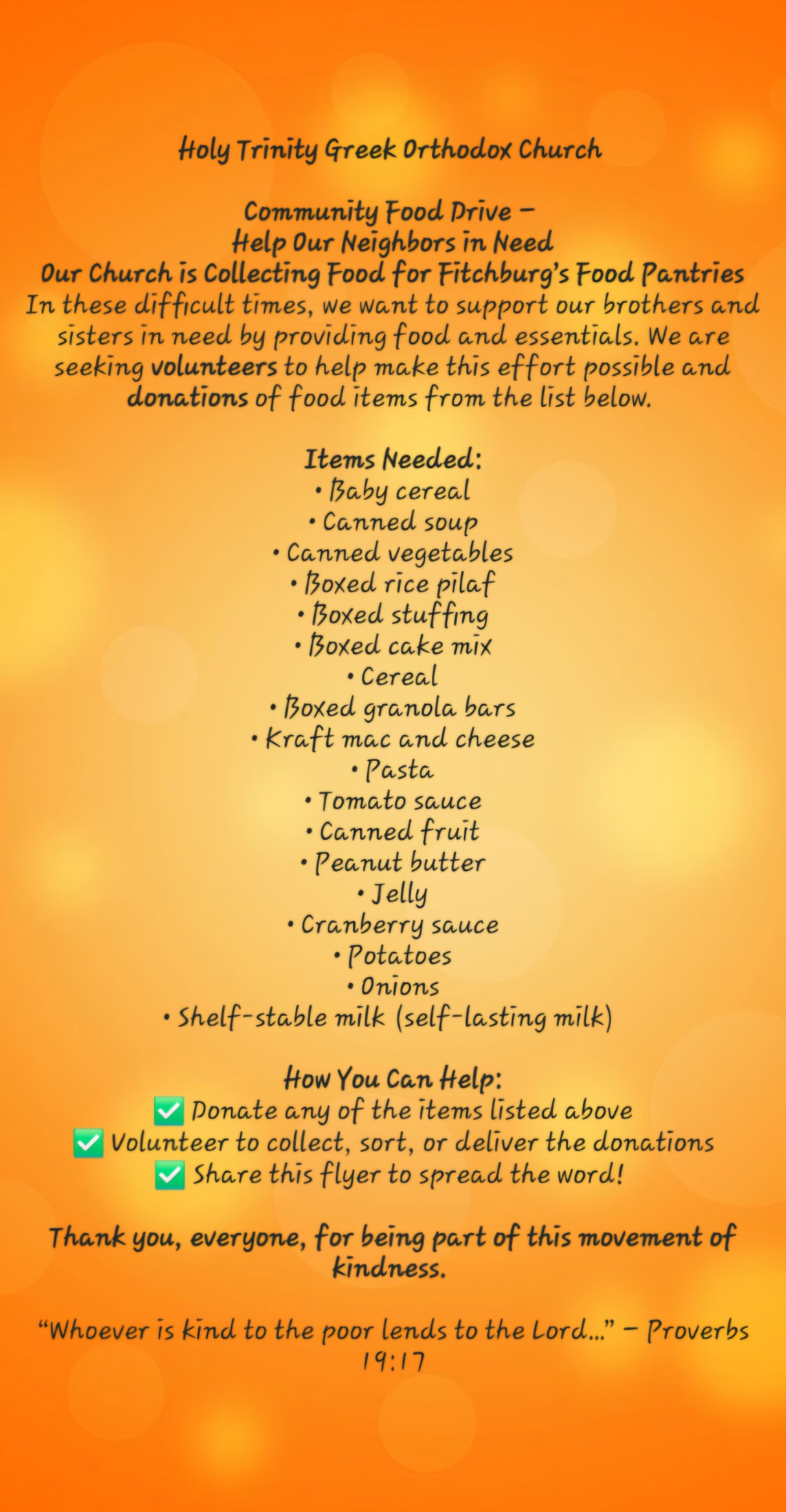 In the days leading up to Thanksgiving and Christmas, Holy Trinity is hosting a community food drive to support families in need. We are asking that parishioners please consider donating non perishable food items (canned and dried boxed food) to be delivered to local homeless shelters and food pantries in the Fitchburg area. Please leave your donations in the designated boxes in our lower hall. For those who wish to volunteer to deliver food to the shelters, please email Father Andrew at fatherandrewbushell@gmail.com. Thank you for your generosity!