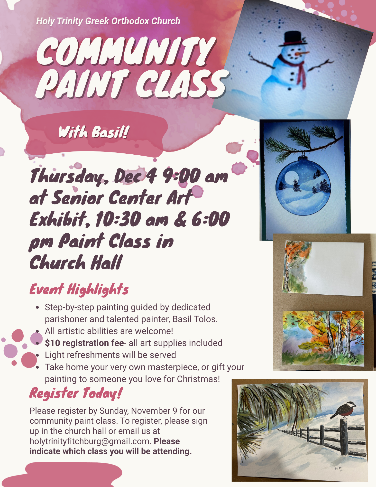 Join us this month for fellowship, learning, creativity and fun with our Community Paint Classes! Painting will be held on Thursday, December 4, in the morning at 9:00 am beginning with a visit to the Senior Center for an Art Exhibit followed by painting in the church hall at 10:30 am, and 6:00 PM in the evening on the same day, in our church hall. Registration is $10 a person and will cover supplies and the class itself. Mr. Basil Tolos, a dedicated parishioner and talented painter, has offered to teach us how to paint Christmas cards paintings. We thank him for his time and for offering his beautiful talent to our church community. Please see the flyer attached for more details on how to register. We look forward to seeing you there!