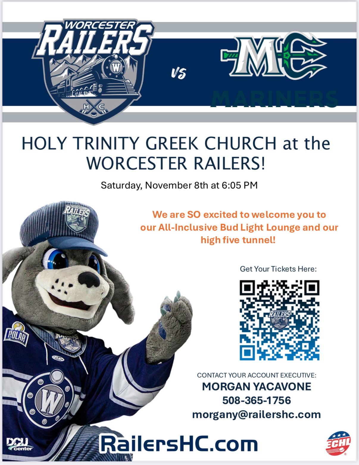 Holy Trinity invites all community parishioners and families to a community night of fun and fellowship at the Worcester Railers game on Saturday, November 8 at 6:05 PM. Enjoy exclusive access to the Bud Light lounge that includes pizza, hot hors d'oeuvers, popcorn, soft drinks, water, dry snacks, and more! This is one of the Worcester Railers biggest games, as they promote their "Hockey Fights Cancer" night, where Bruins Alumni play against Why Me All Starts for the pregame event.