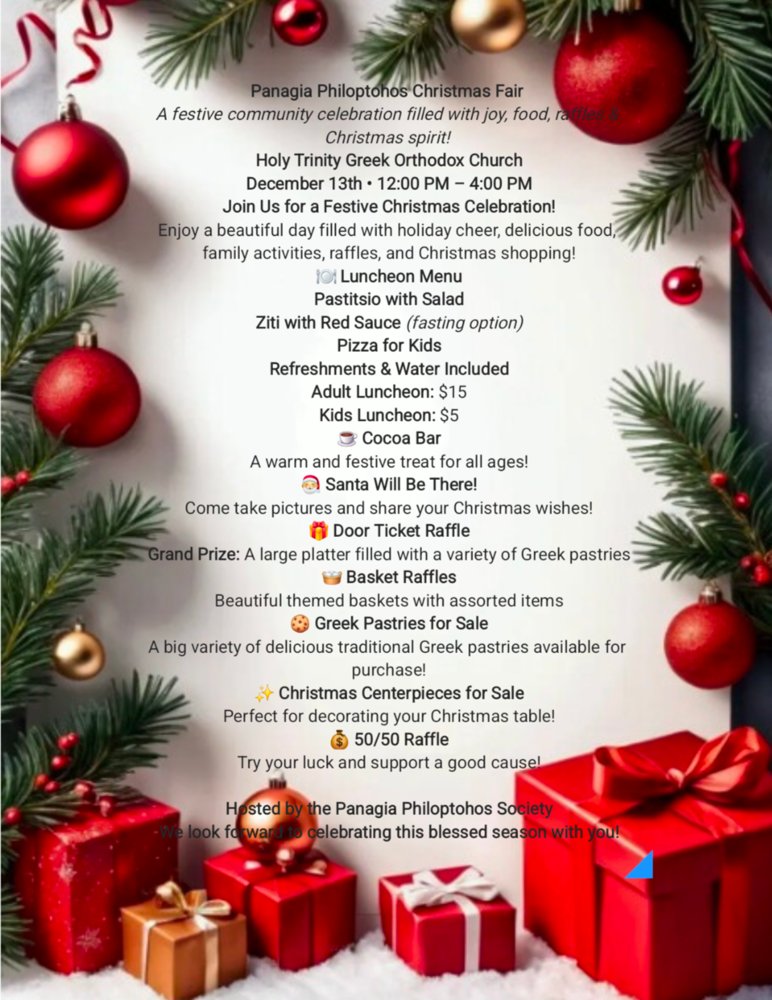The Panagia Philoptochos Chapter of Holy Trinity invites you to their Annual Christmas Fair on Saturday, December 13, 12:00 PM - 4:00 PM. The fair will include lunch, raffles, gift shopping, Hot Coacoa, and a special visit from Santa Claus himself! Please see the flyer for details. We look forward to seeing you there!